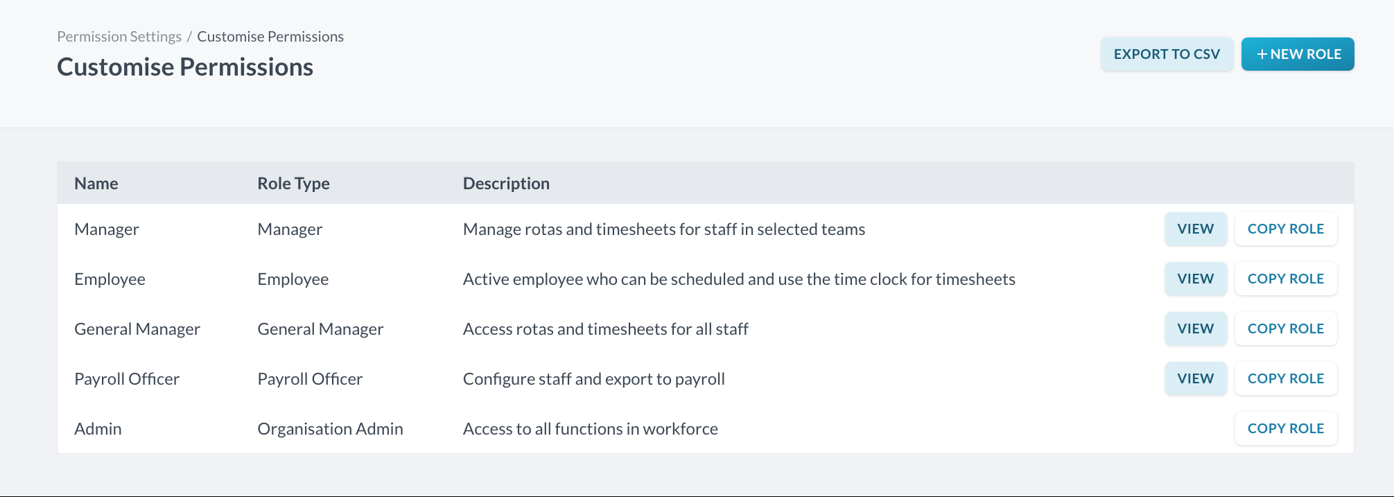 A permission level (also referred to as a role) defines what actions a user can perform across the platform, such as viewing data, editing records, approving requests, or publishing rotas.