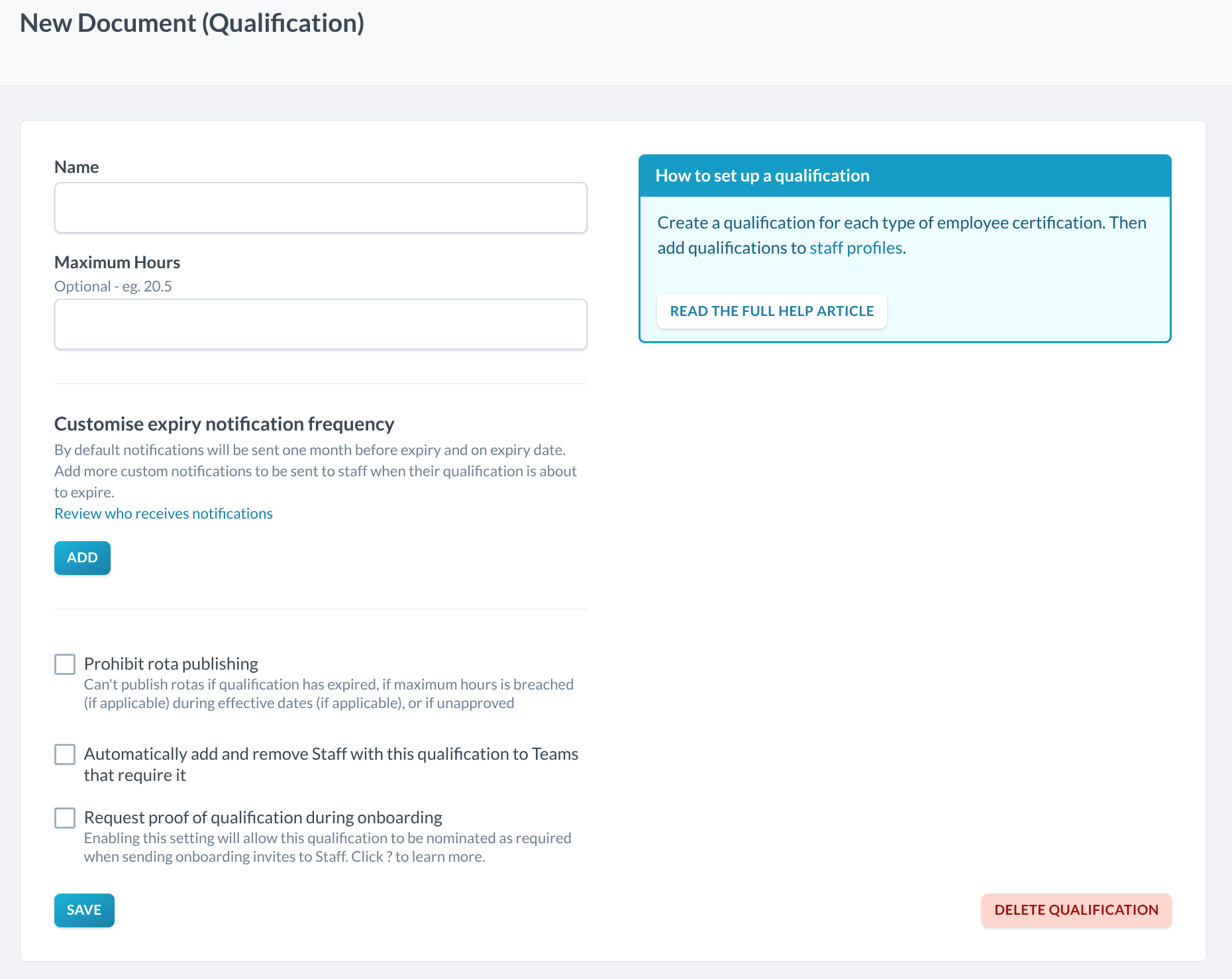 To create a qualification, navigate to Workforce > Qualifications and click + New Qualification. You only need to give the qualification a name. All other fields are optional, such as: