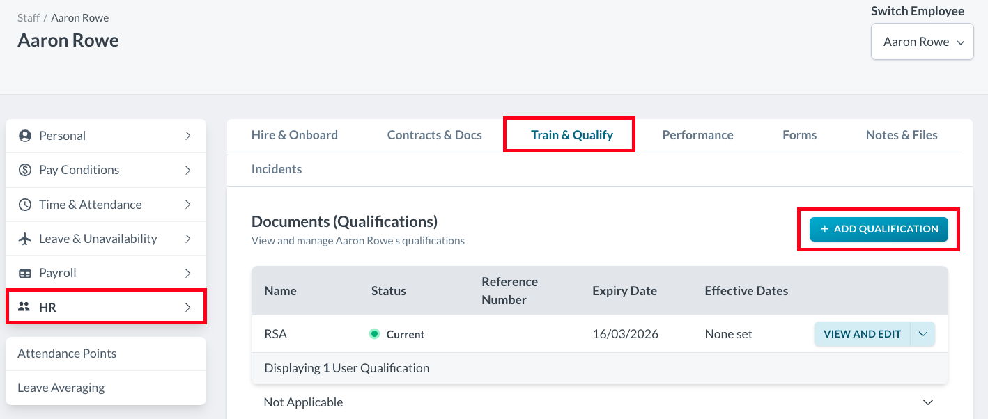 You can assign a qualification to an employee within their profile.