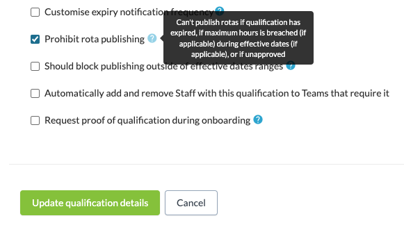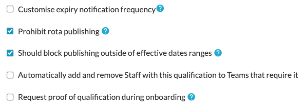 To do this, go to Workforce > Qualifications > click the ‘pencil icon’ to edit the qualification > tick the box that says ‘Prohibit rota publishing’. An additional option will appear if you want to block publishing outside of effective date ranges.