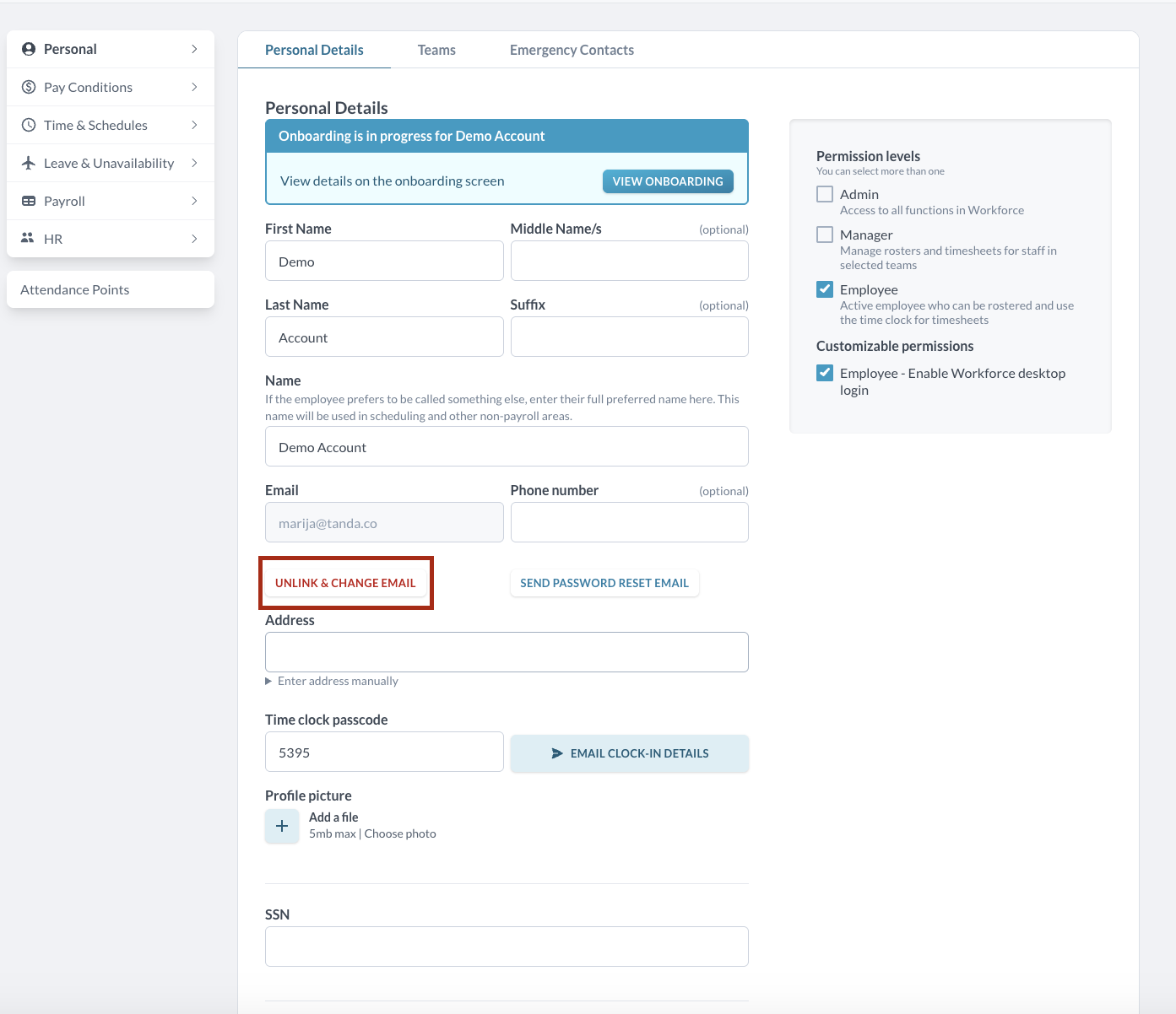 To update an employee’s email address, navigate to the employee’s profile. Under Personal Details, select “Unlink & Change Email.”