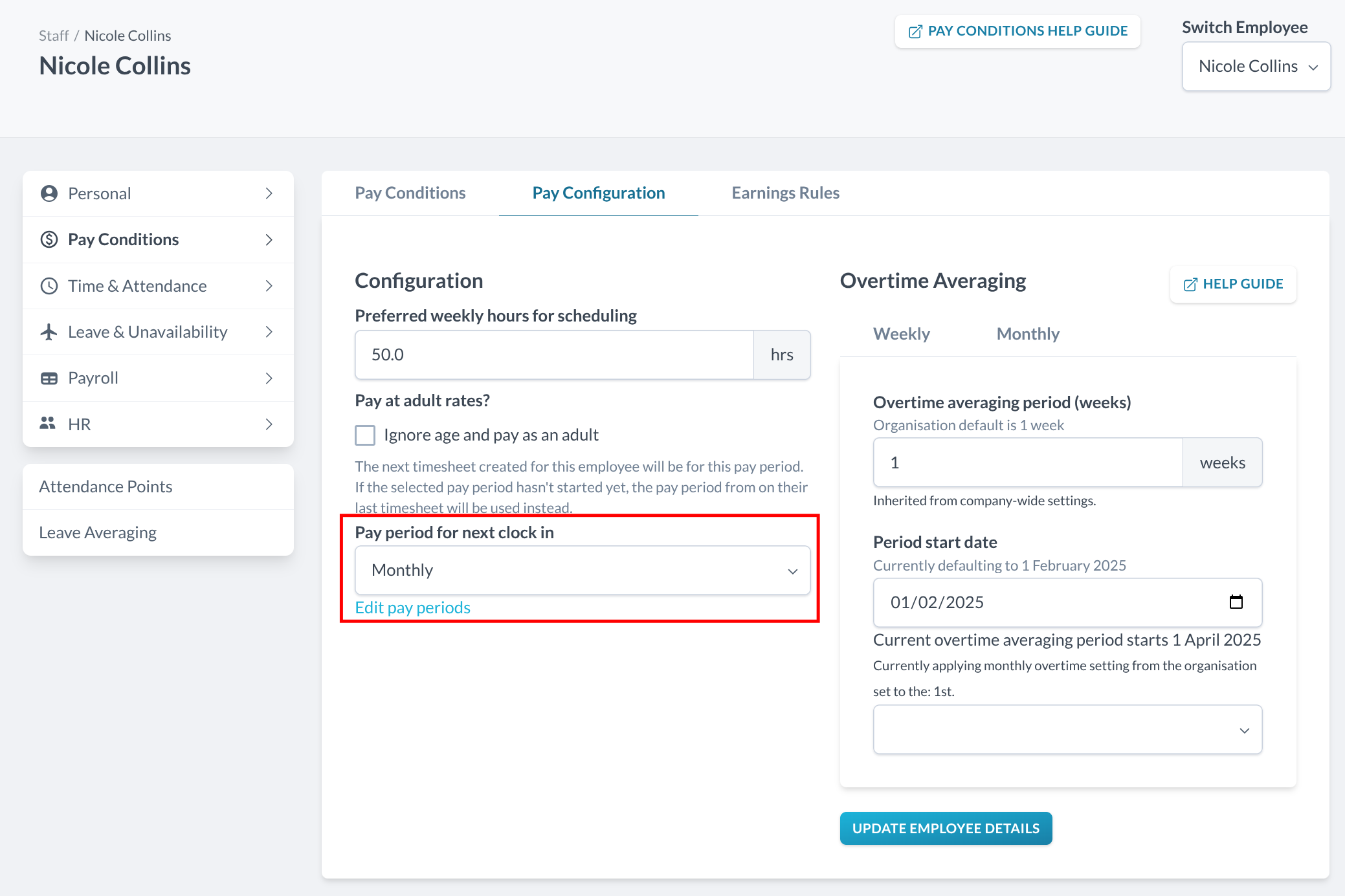Once a pay period has been created, you can assign it to employees by navigating to their profile > pay conditions > pay configuration or by using the bulk tagging tool.