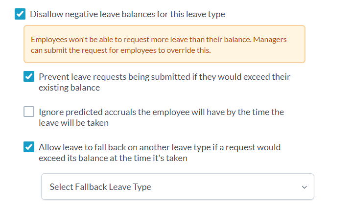To turn on leave fall back for a leave type, select the leave type you wish to edit. Turn ON 'Disallow negative leave balances for this leave type, and then turn ON 'Allow leave to fall back on another leave type if a request would exceed its balance at the time it's taken'.