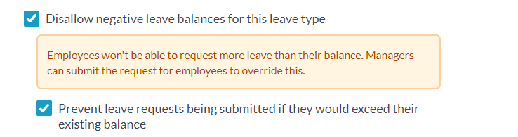 This prevents employees submitting leave requests if their request would put them into a negative balance of this leave type.