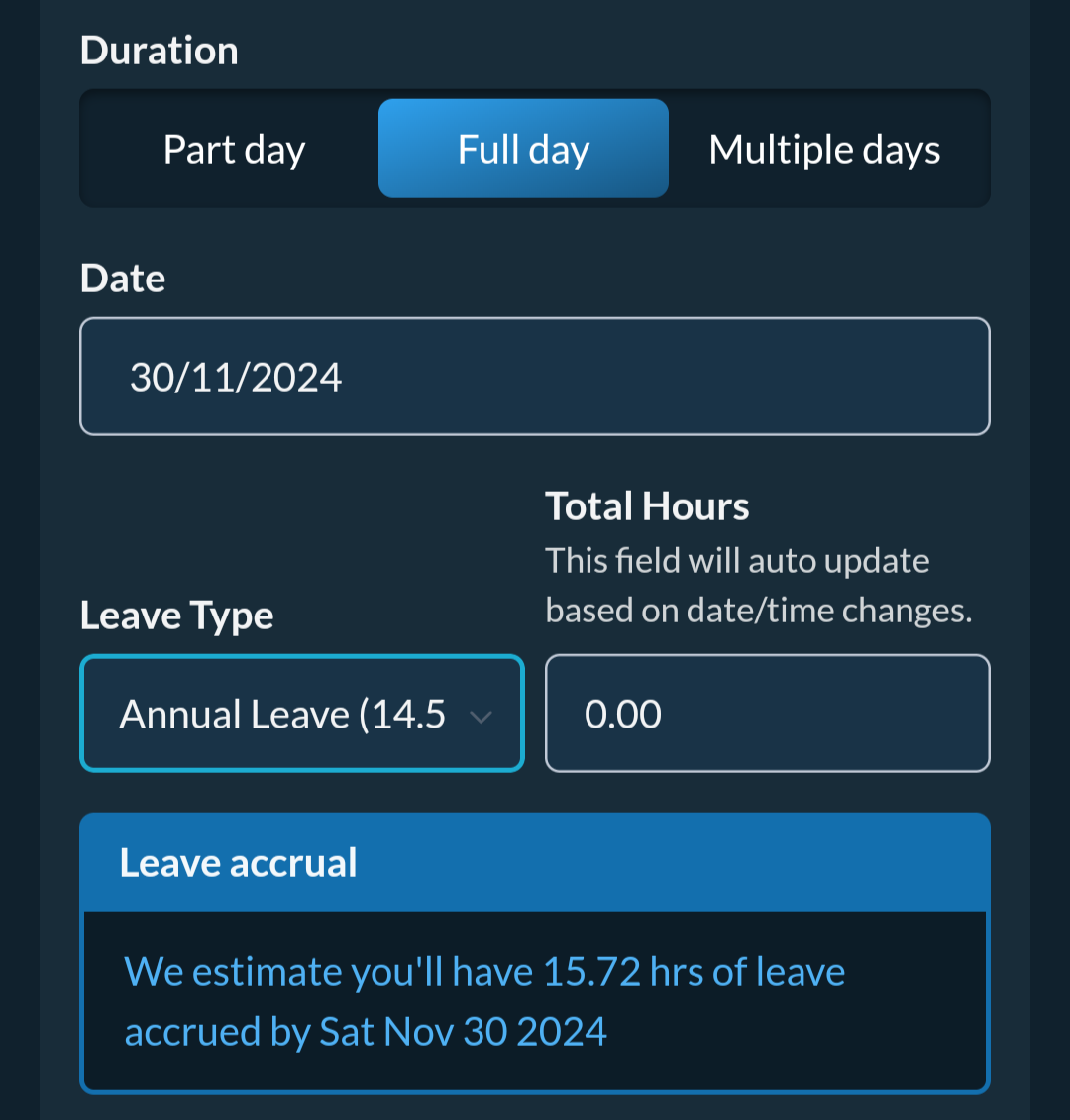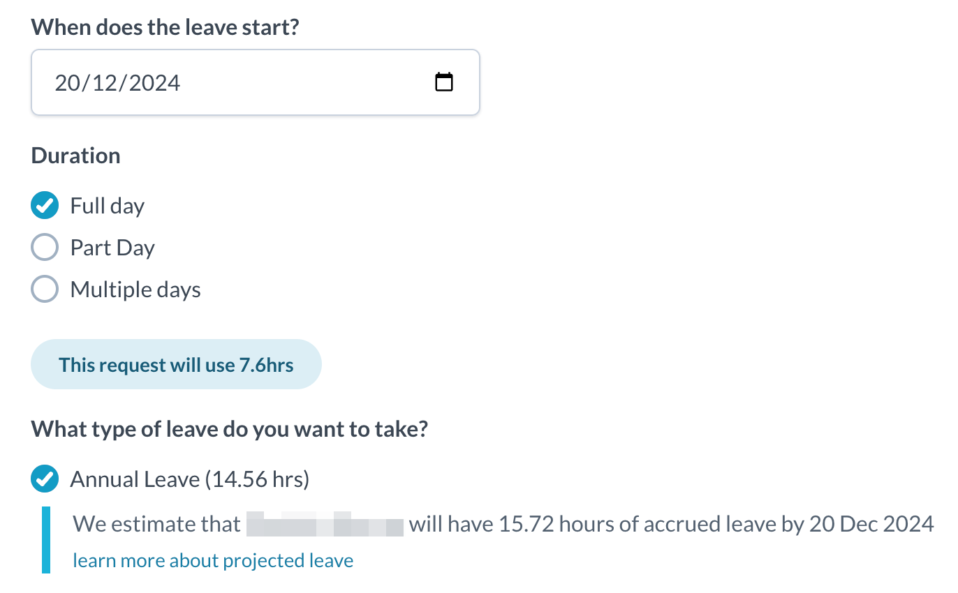For example, an employee may want to request leave over Christmas. However, it's only March, so they don't have a sufficient leave balance. By checking their projected balance, the employee can confidently request leave, knowing they will have enough leave accrued by Christmas.