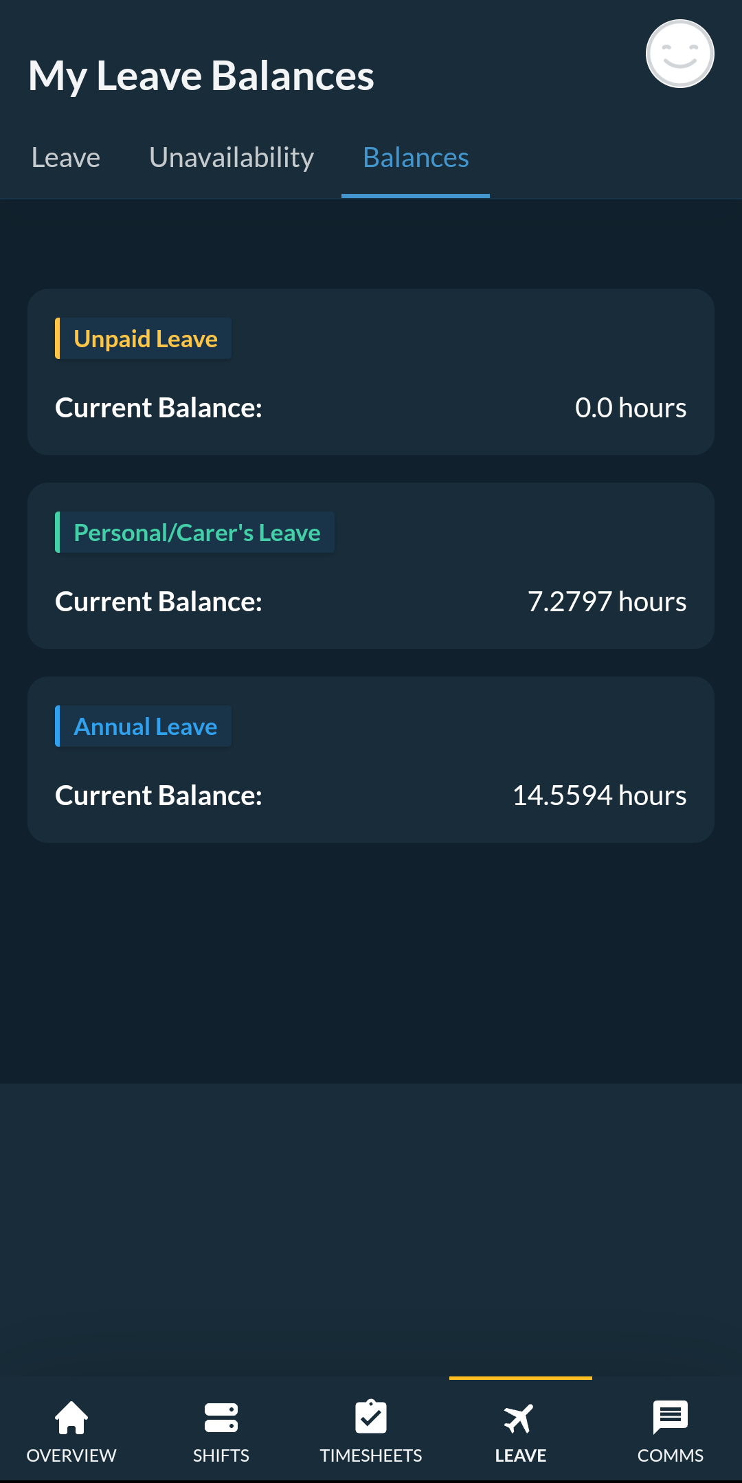 To see your current leave balance in the Workforce Mobile App, navigate directly to the Leave tab, then select Balances. Here, you can view your current balances for each leave type.