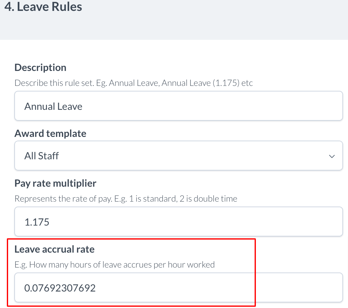Next, you must stipulate an accrual rate for each leave type. To do so, navigate to Time & Attendance > Compliance > Leave Types > Manage. Then, click on the leave type you want to edit, scroll down to the 'Leave Rules' subheading, and enter a leave accrual rate.