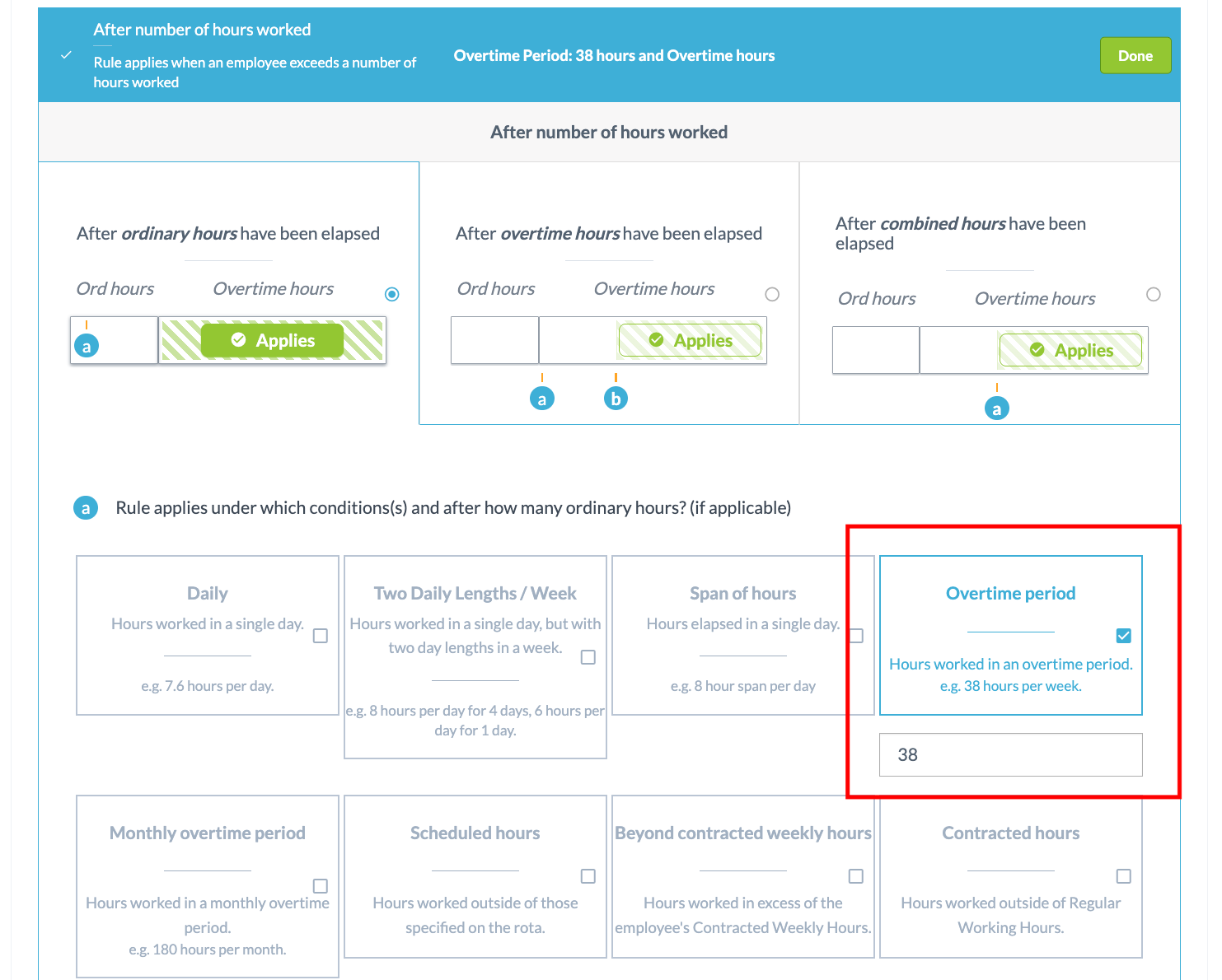 Set conditions (e.g. after 38 weekly hours).