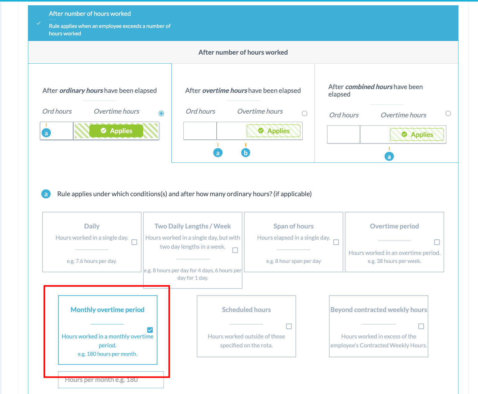 Best practice: Create generic Ordinary Hours rules without detailed conditions. Leave specifics (such as maximum hours or times of day) to your Overtime rules. This creates a foundation on which other rules can build.