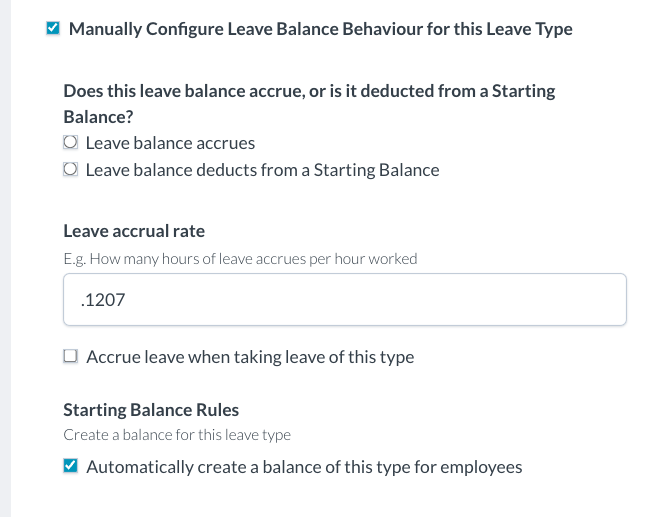 If your leave balance accrues, input the rate in the Leave Accrual Rate section. We recommend enabling the Automatically create a leave balance of this type for employees. This means that once you tag the staff member with the appropriate tag, they will automatically get a balance of 0 allowing for the calculation to begin.
