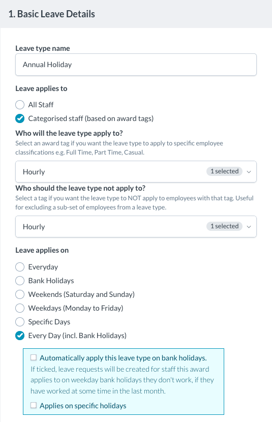 If choosing Leave applies everyday (including bank holidays), you will also have the option to automatically apply leave on bank holidays.