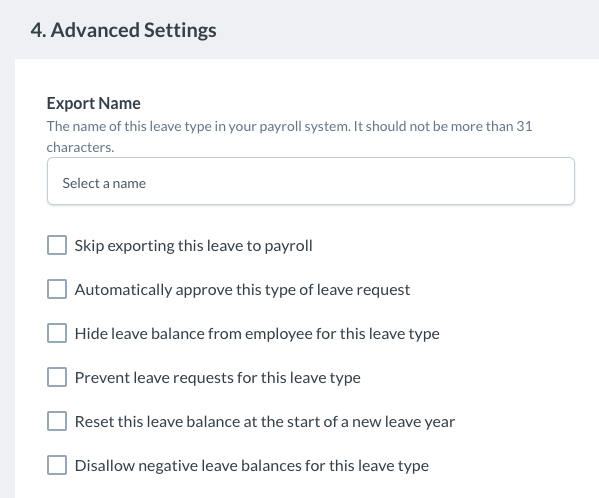 If you want this type of leave to be excluded when exporting to payroll, tick the box in Step 5: