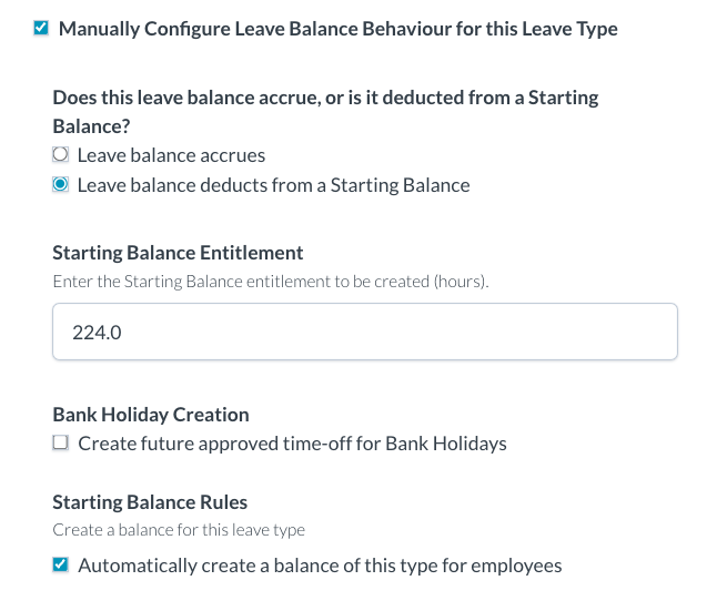 If your leave balance accrues, input the rate in the Leave Accrual Rate section. We recommend enabling the Automatically create a leave balance of this type for employees. This means that once you tag the staff member with the appropriate tag, they will automatically get a balance of 0 allowing for the calculation to begin.