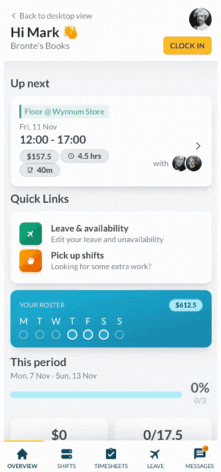 On this page, you can scroll through your shifts for the current week, scroll back to shifts in the past, and scroll forward to future shifts that have been published.