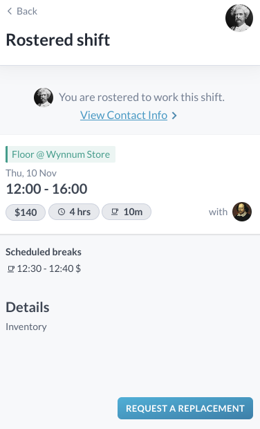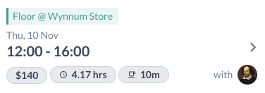Clicking into a shift card will also show any additional shift details and actions, including: