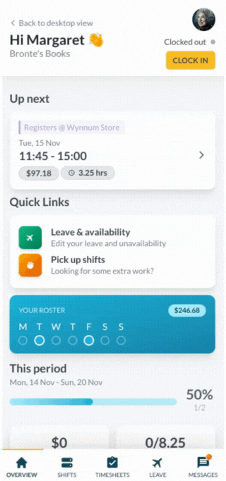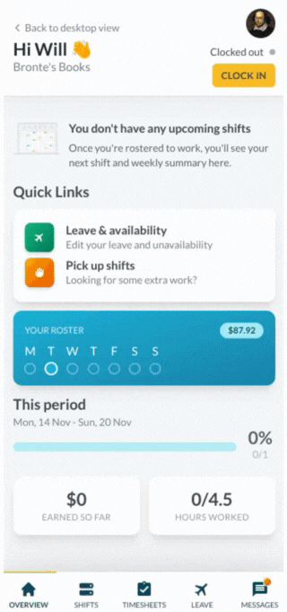 The same process will apply when clocking onto a break or clocking out of your shift. You'll receive confirmation each time you clock in and out.