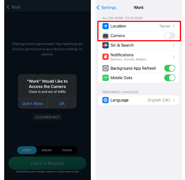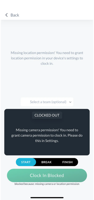 In order to record an accurate clock in, the mobile app requires permission to access your location and camera while using the app. This information is used by your organization to ensure the right employees are clocking in at the right places.