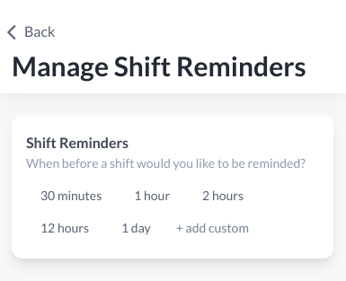 Multiple reminders can be set through the Settings tab on the profile page. For example, 2 hours before your shift and then 30 minutes before your shift, you'll receive a reminder.