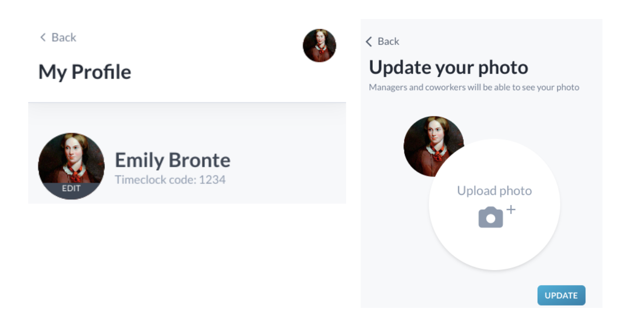 To remove a profile picture, select the 'Edit' option in settings, and select the blue 'Update' button without choosing a photo. Your image will be replaced with recent clock-in photos, and will only be visible to managers.