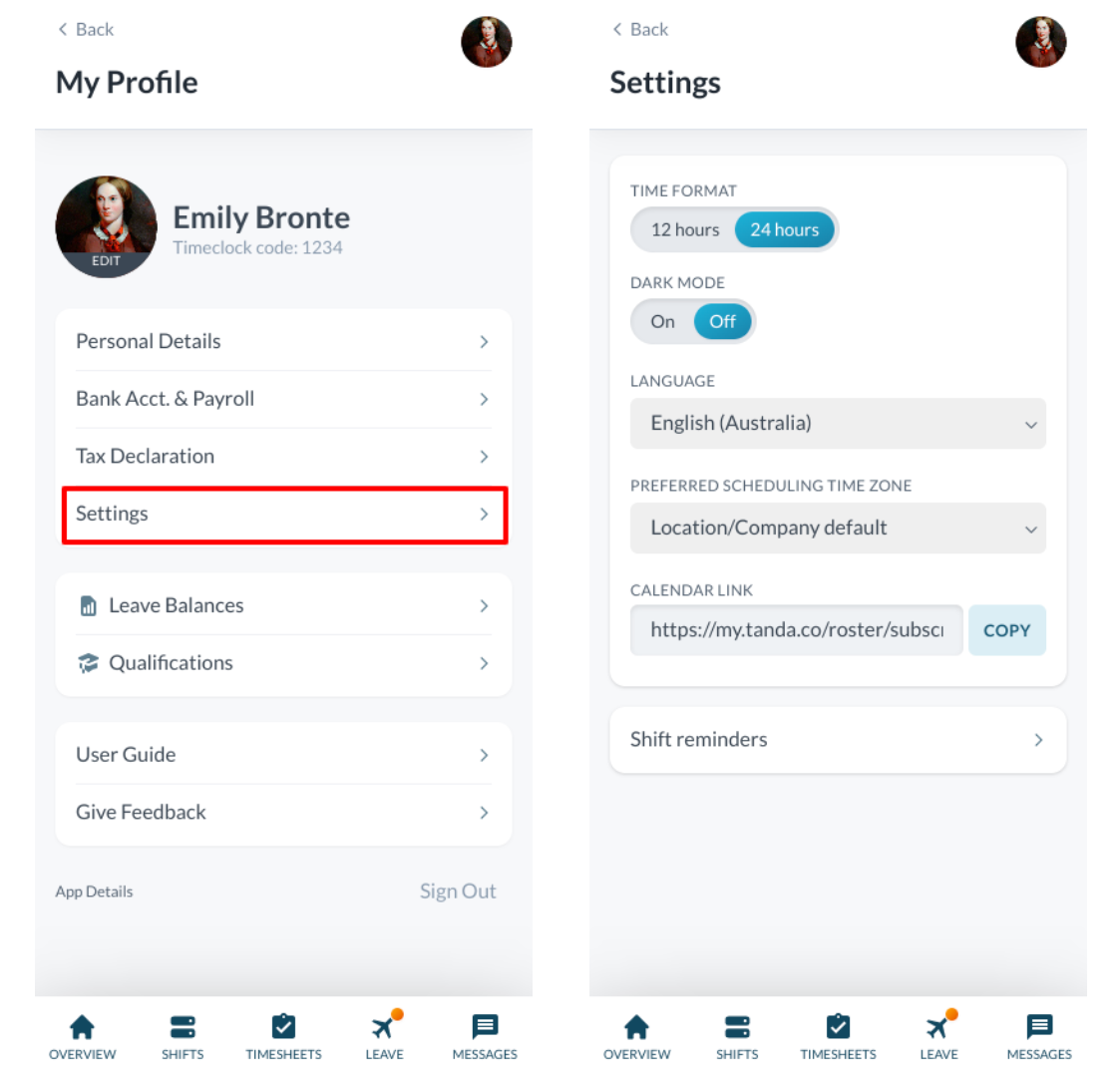 See your shifts on your personal calendar by adding your roster. On the app, click the Copy button next to the Calendar Link in the Settings page.