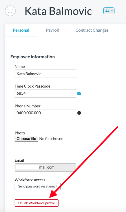 To change an email address so that a user can switch between accounts, you will need to do so within the staff memer's profile. Go to Workforce > Staff > Staff Profile > Unlink Workforce profile: