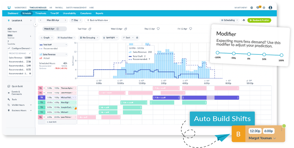Workforce.com can forecast labor demand by analyzing indicators such as weather, foot traffic, historical sales, economic trends, events, holidays, booked appointments, and other relevant factors. With these insights, you can better anticipate demand for a given period, reducing the risks of overstaffing.