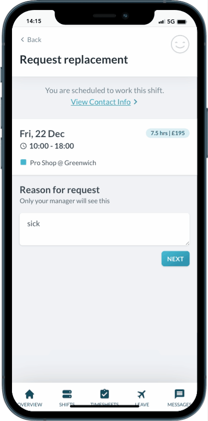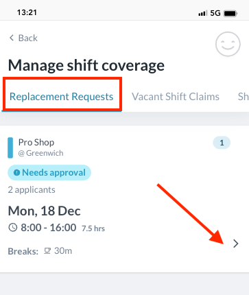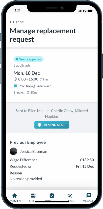 You can manage the entire shift replacement process or allow employees to manage finding cover for their own shifts.
