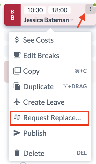If you need to offer an existing shift to staff for claiming, you can do so by navigating to the rota and clicking the 3 dot icon and selecting Request Replacement from the dropdown menu: