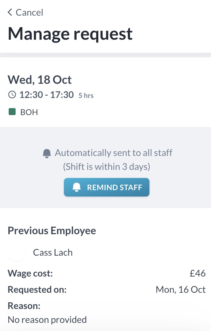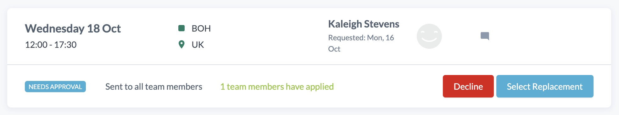 Managers and employees can submit replacement requests. Only managers can choose who to send requests to. Employees can claim shifts offered to certain staff immediately, but a manager must select which cover offer to accept for a request offered to a whole team. |