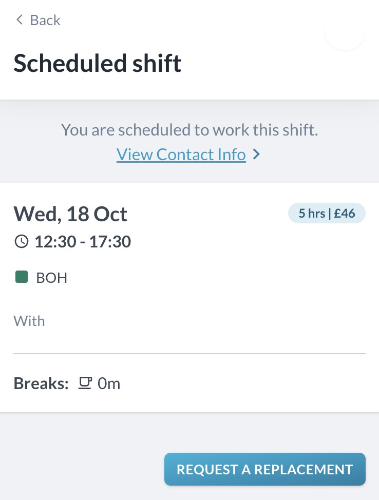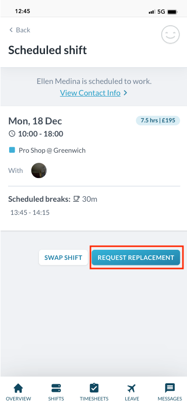 Through the employee's schedule, they can select the shift they are unable to work, followed by the 'Request a replacement' button: