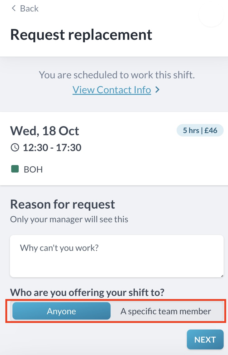 If 'recipients of shift replacements can be chosen by staff' is enabled within settings, staff can select to offer to specific team members: