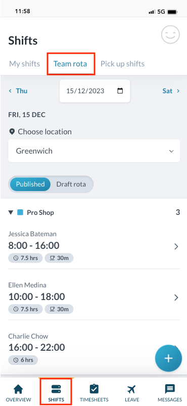 Managers can initiate a shift replacement on behalf of an employee. To do so, go to Shifts > Team Rota.