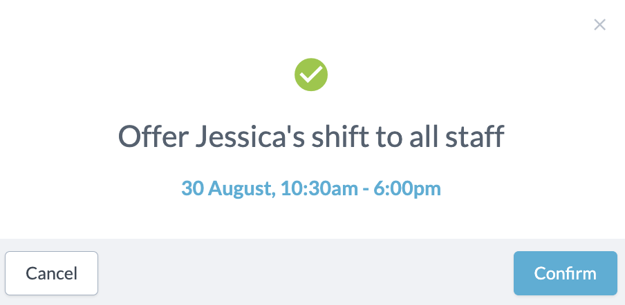 They must select Offer to Cover button to offer to claim the shift, which will ask the employee to confirm the action: