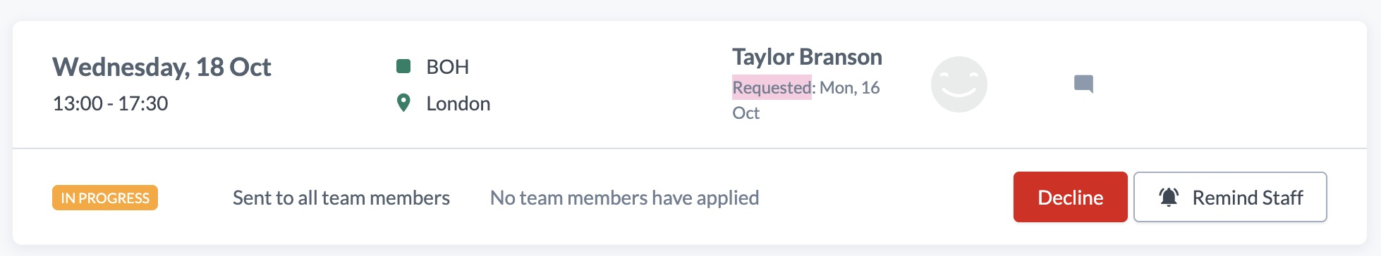 Once offered, you can select the Remind Staff button which will send a reminder to all staff that there is an available replacement request: