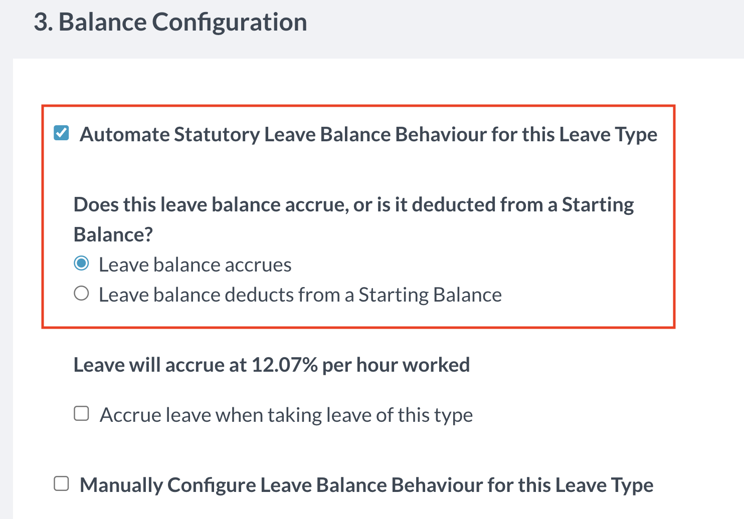 In step 3 'Balance Configuration', select Automate Statutory Leave Balance Behaviour. You will then have to decide if this is a leave type that accrues or deducts: