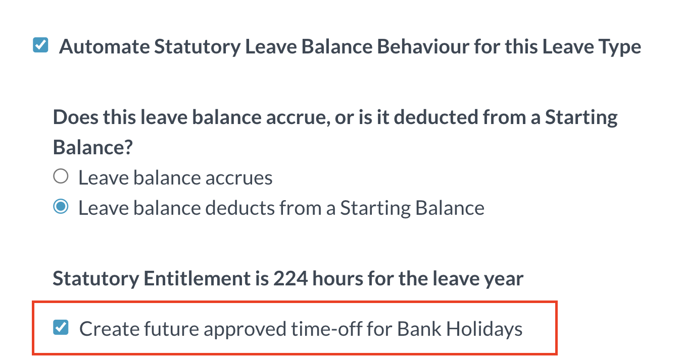 If the leave type deducts, then we will automate the creation of starting balances based on the 28 days (224 hours) that an employee is entitled to. Learn more about holiday entitlements here. You can also choose if future time-off requests will automatically be created for upcoming bank holidays.