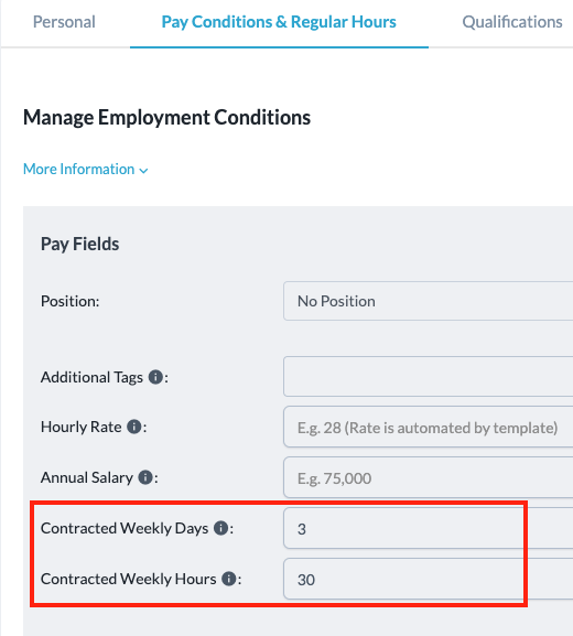 Important: For the most accurate leave in days, you must set the Contracted Weekly Days and Contracted Weekly Hours within an individual employee's profile: