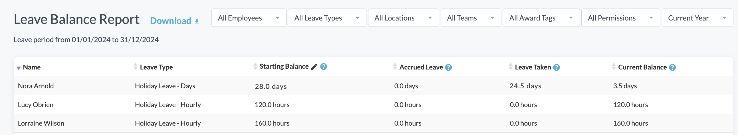 Once you've set your leave year start date, created the leave types, tagged your staff and imported their starting balances, you can view all of it under Reports > Leave Balance Report: