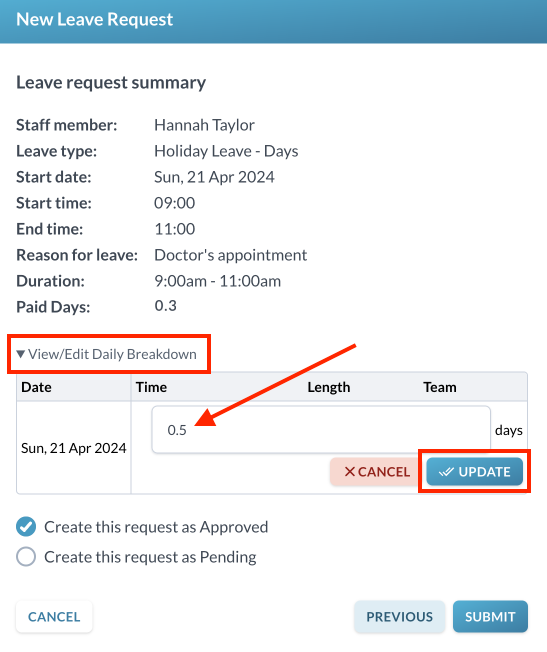 Once the leave request is approved, any updates made to the daily breakdown will show.