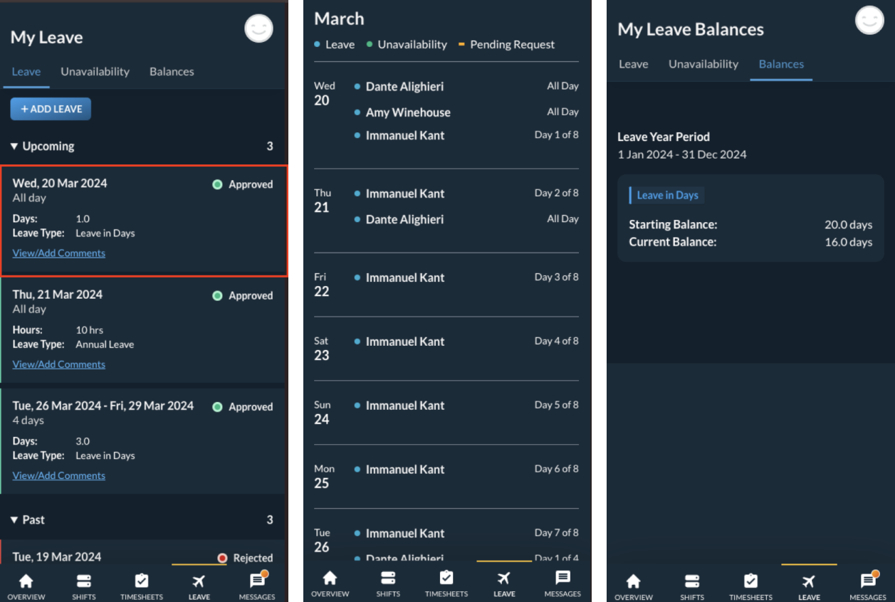 Leave in days will display within the mobile app in the following locations: