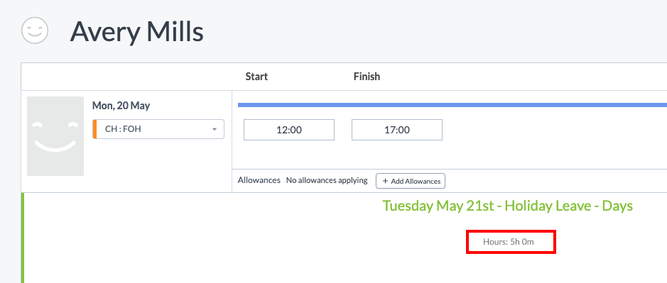 Once the leave request is approved, it will appear on the timesheet for that date/dates. The leave request will appear in form of a shift, which will display in hours. This is to show the number of hours that are considered a "day of work" for that employee: