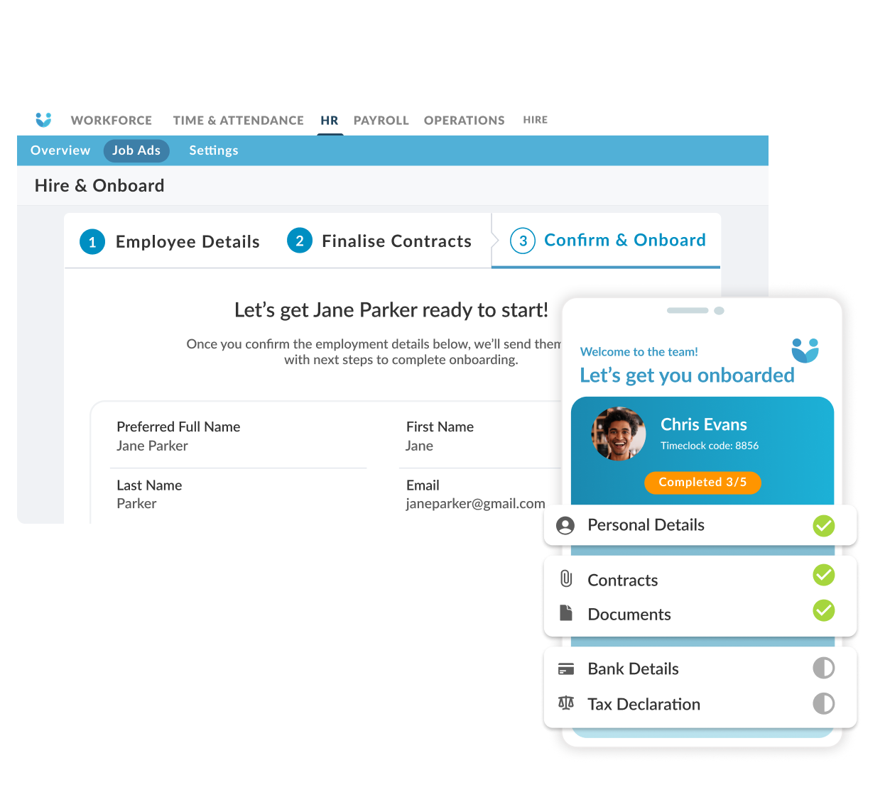 Paperless employee onboarding lets you capture new hires' details, sending the information straight into Workforce.com. You're never chasing down and re-entering documents last minute to get staff ready for day one.