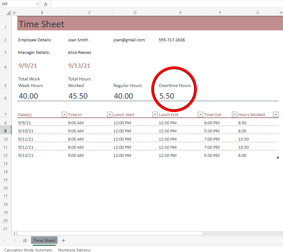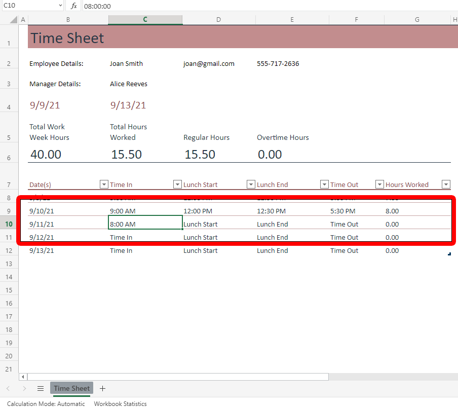 Using Excel, or any similar spreadsheet such as Google Sheets, to keep track of employee schedules and timesheets has several advantages over pen-and-paper methods: