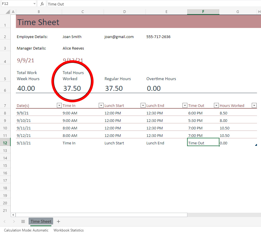 If you have entered the data using the correct format, the total hours worked should automatically be calculated at the top of the timesheet.