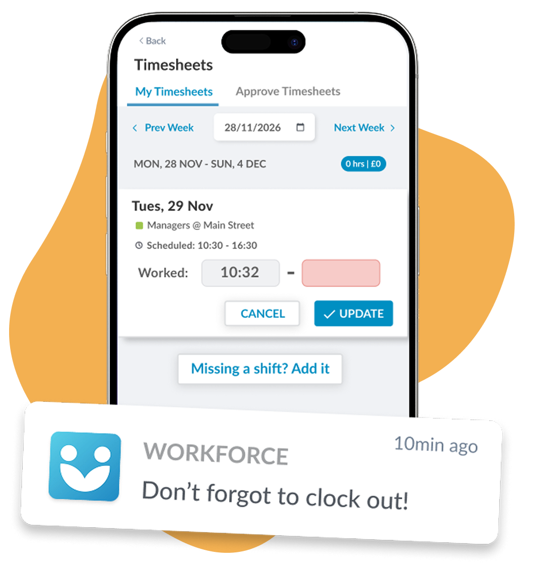 Remind staff to fill out any missed times based on scheduled hours, while managers are prompted to approve timesheets each day. It means you aren't chasing staff or managers for missing or unapproved timesheets, so you can run payroll quickly.