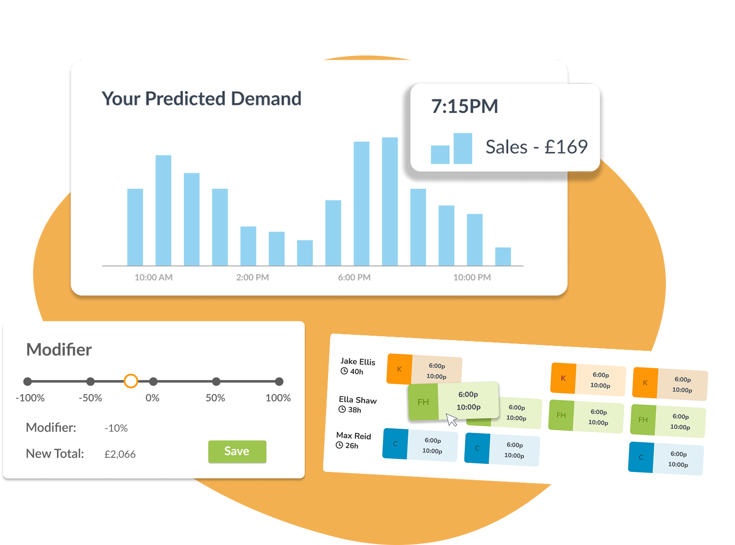 Pull revenue and itemised sales data from ROLLER, then use Workforce.com's demand modifiers to build schedules tailored to sales per labour hour. Adjust the demand slider, and never worry about being understaffed again.