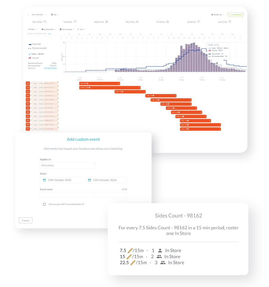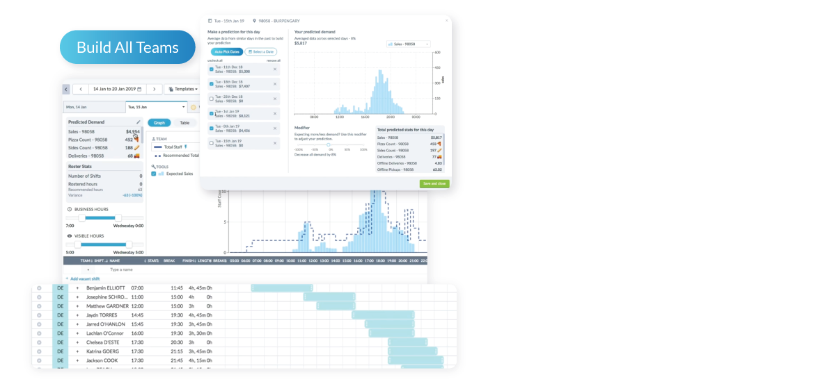 Demand prediction is the first key step in scheduling. The more applicable information a manager can collect, the more accurate and confident they can be with demand prediction. The right software will take into consideration factors such as weather or time of year, but managers also have a human role in this. They can identify demand predictors that are unique to that location.