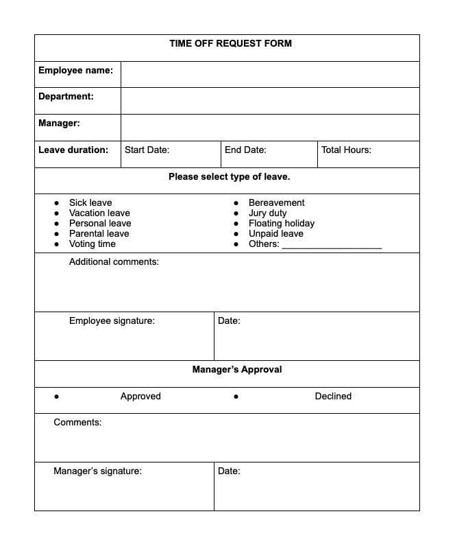 It's easy to accidentally overlook time off requests when you don't document anything. Download and customize this form to standardize how employees request their time off.