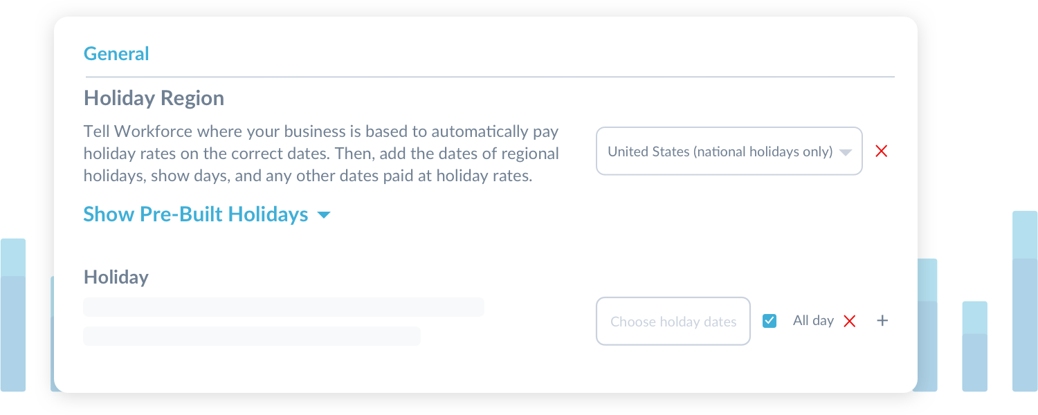 • Define holidays that your company recognizes on a location-by-location and national basis.