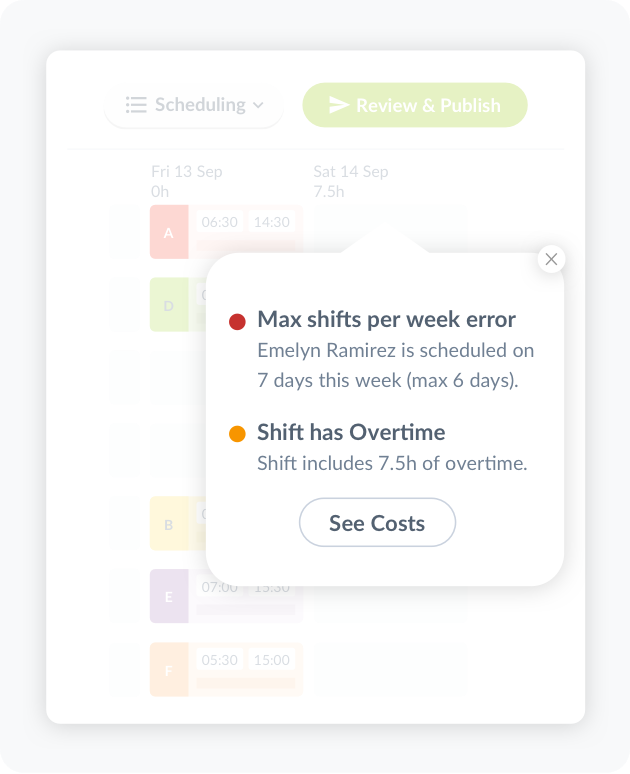 Automate labor compliance when building work schedules. Quickly address potential violations or penalties when scheduling employees.